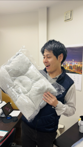 笹島社長から従業員ひとりひとりに労いの言葉を添えてお渡しいただきました。従業員の皆さんも「今日から睡眠が楽しみです。」と笑顔で受け取っていました。